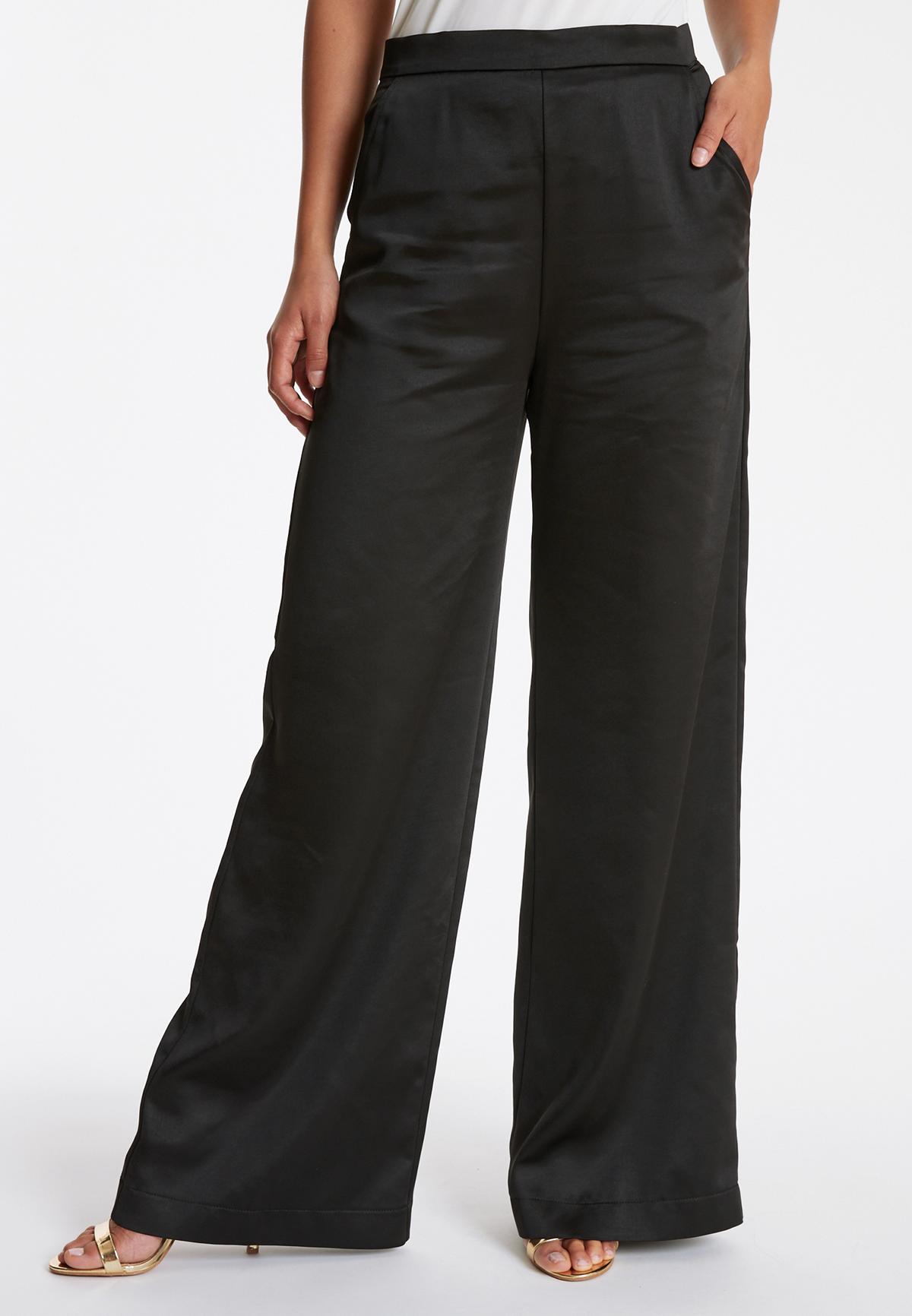 Kreiere für die abendliche Partytime einen edel-coolen All-Black-Style: Entscheide dich für eine leicht schimmernde, fließende Palazzohose und trage dazu ein schwarzes Seidentop mit Spaghetti-Trägern und Spitzeneinsatz am Rückenteil. Riemchensandalen mit Absatz und goldener Statement-Schmuck vollenden das Outfit.