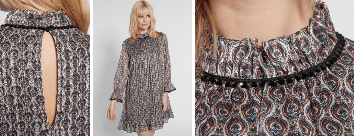 Eine weitere angesagte Variante des hochgeschlossenen Kleids sind Midi- oder Maxikleider mit Ethno-Attitüde. Details wie Volants, verspielte Paisley-Prints, fließende Stoffe und Rüschen zeichnen diese Modelle aus. Diese Kleider sind meist mit 3/4-Ärmeln versehen oder langärmlig. Im Sommer kannst du Sandalen, Sneakers oder Cowboy-Stiefel dazu tragen – Schlapphut nicht vergessen. Im Herbst passen auch Chelsea Boots oder Plateau-Stiefel. Layering bietet sich hier an, um die Dresses wintertrauglich zu stylen: Wie wäre es mit einer ärmellosen Kurz-Weste oder einem rustikalen Cardigan?