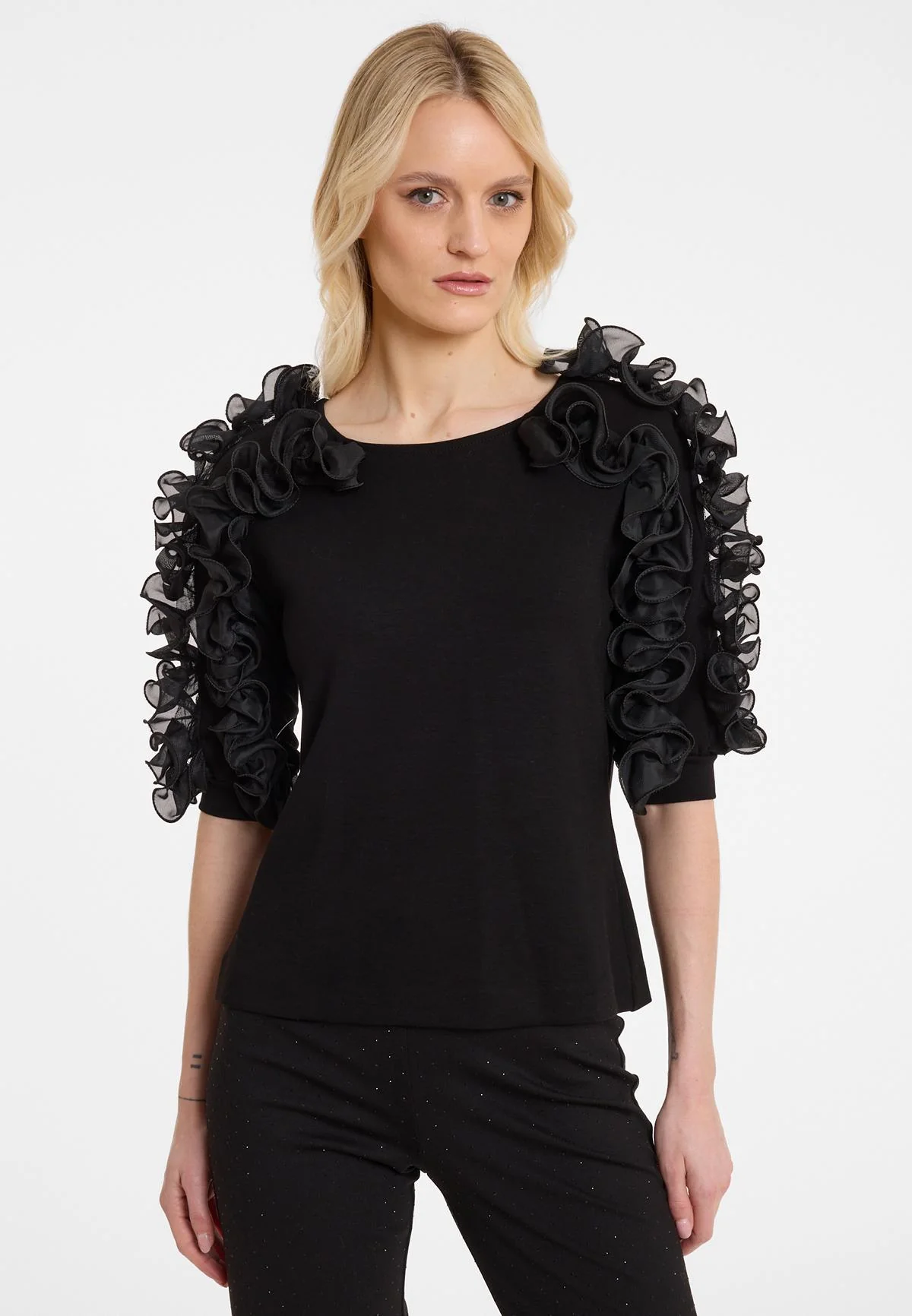 - • All-Black ohne Struktur – ohne Textur verliert das Outfit an Spannung