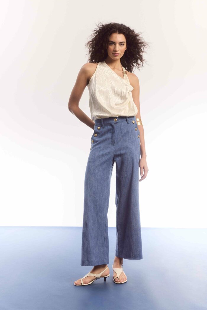 Weiteres Plus: Leichter Denim liegt nicht vollständig auf der Haut auf. Durch die typische – auf mikroskopischer Ebene unruhige – Diagonalstruktur entstehen zwischen Haut und Gewebe kleine Luftkanäle; die Luft kann also zirkulieren. Sommerdenim punktet nicht nur beim Komfort, sondern auch in der Optik: Durch die leichte Grammatur entstehen weniger ‘scharfe’ Knickfalten und nach dem Sitzen fällt der Stoff schneller in seine Form zurück. Silhouetten wirken locker und der Stoff fällt im Gegensatz zu reiner Viskose – die ja dünner ist – stärker ‘vom Körper weg’.